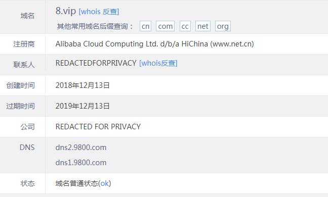 查詢whois顯示,域名8.vip注冊時間是2018年12月,該域名在2018年12月24日發(fā)生變更,現(xiàn)處于隱私保護狀態(tài),輸入8.vip域名,會跳轉(zhuǎn)到小志域名交易頁面,并接受議價,價格合適可能會再次出現(xiàn)交易。