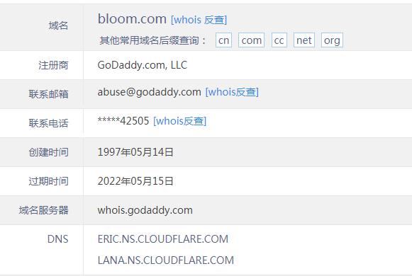 查詢whois發現,域名Bloom.com注冊于1997年5月,距今有22年歷史,是一枚英文單詞米域名,含有“開花、變得健康”的詞義,極其常見,通用范圍廣,且含義積極正面,對應著國外諸多終端公司,頗具市場潛力。